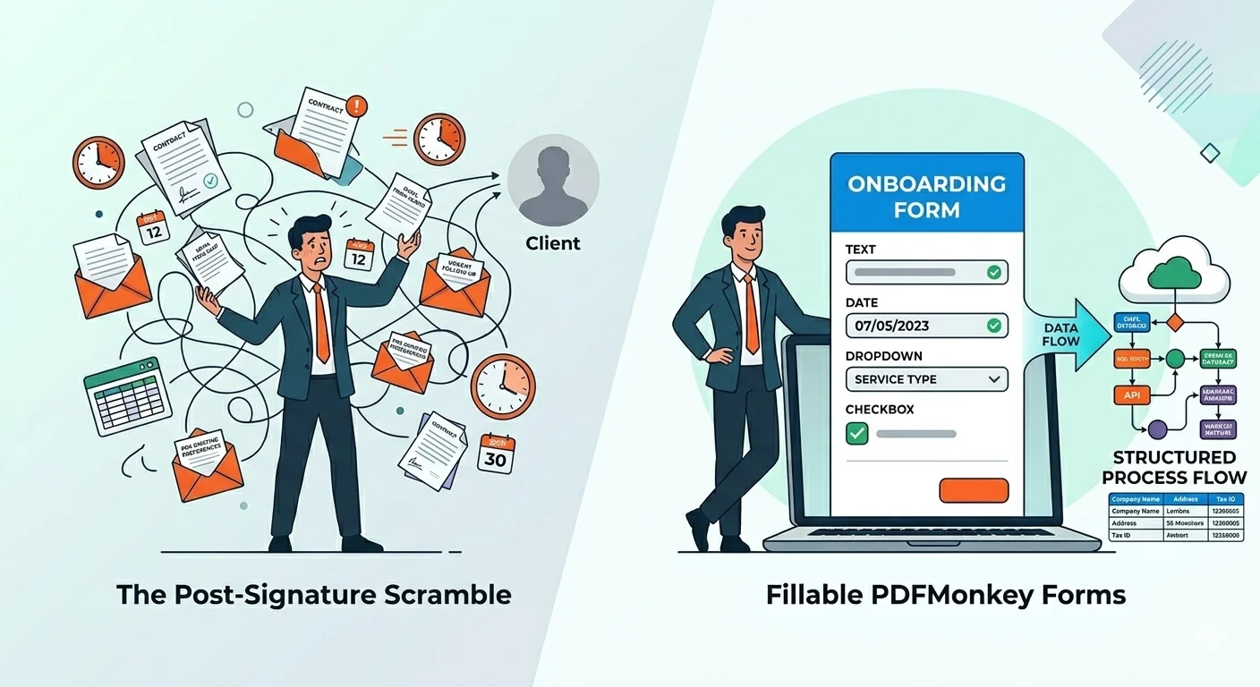 In five years of building PDFMonkey, the thing I have learned is that the best onboarding experience is the one the client barely notices. It just works. A professional form arrives, they fill it out, and you start delivering. That is what learning how to create fillable PDF forms the right way gives you – less friction, more trust, and a client relationship that starts strong.